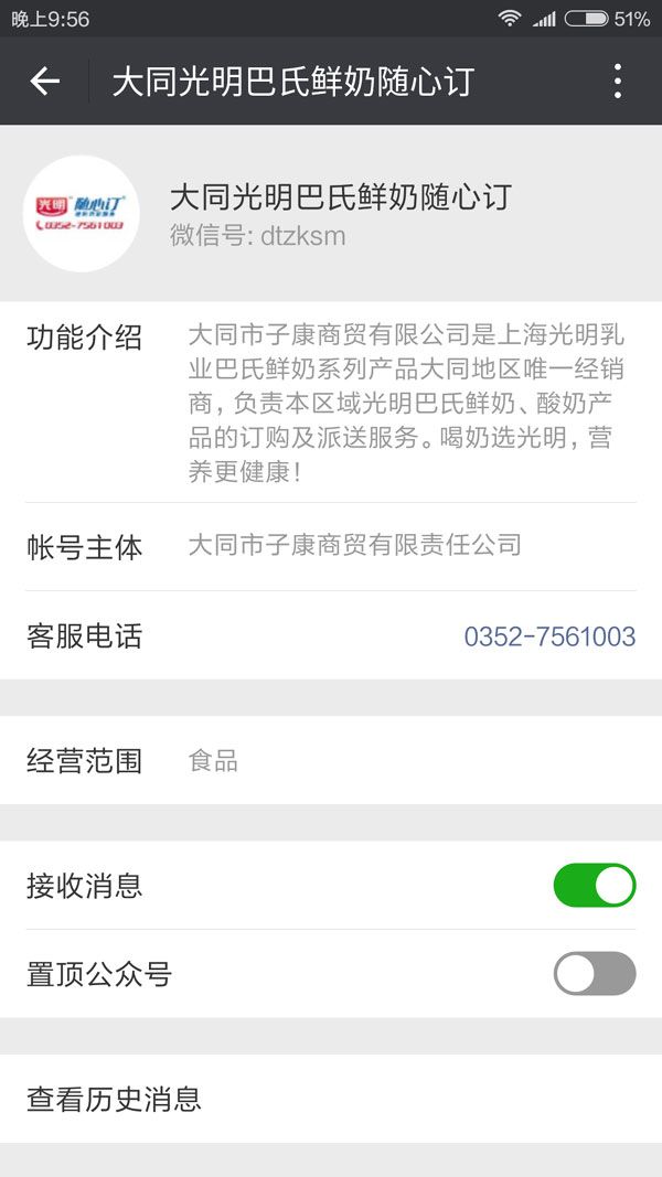 大同光明巴氏鮮奶隨心訂公眾平臺由大同市子康商貿(mào)有限公司授權(quán)開發(fā),大同市宏微信息技術(shù)有限公司提供平臺運營、微網(wǎng)站建設、在線支付等方面的技術(shù)支持,大同子康商貿(mào)是上海光明乳業(yè)巴氏鮮奶系列產(chǎn)品大同地區(qū)唯一經(jīng)銷商,負責本區(qū)域光明巴氏鮮奶、酸奶產(chǎn)品的訂購及派送服務。