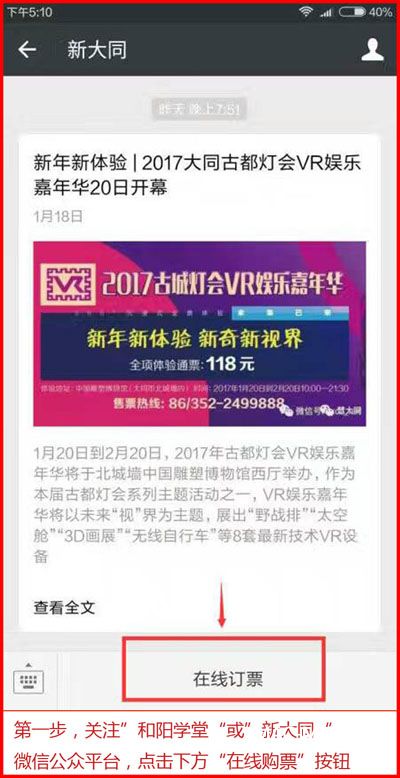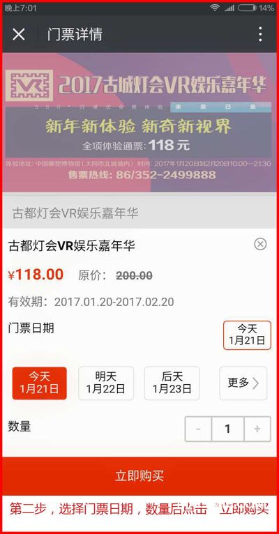 為了有更好的活動(dòng)體驗(yàn),節(jié)省游客的排隊(duì)買票時(shí)間,古都燈火VR嘉年華特別在“大同市和陽學(xué)堂”和“新大同”微信平臺(tái)同時(shí)開設(shè)了網(wǎng)絡(luò)售票通道,無需排隊(duì)無需等待,關(guān)注“大同市和陽學(xué)堂”或“新大同”(微信號:sxdt_net)微信公眾平臺(tái),在線購票后可以持電子門票掃碼直接入場。