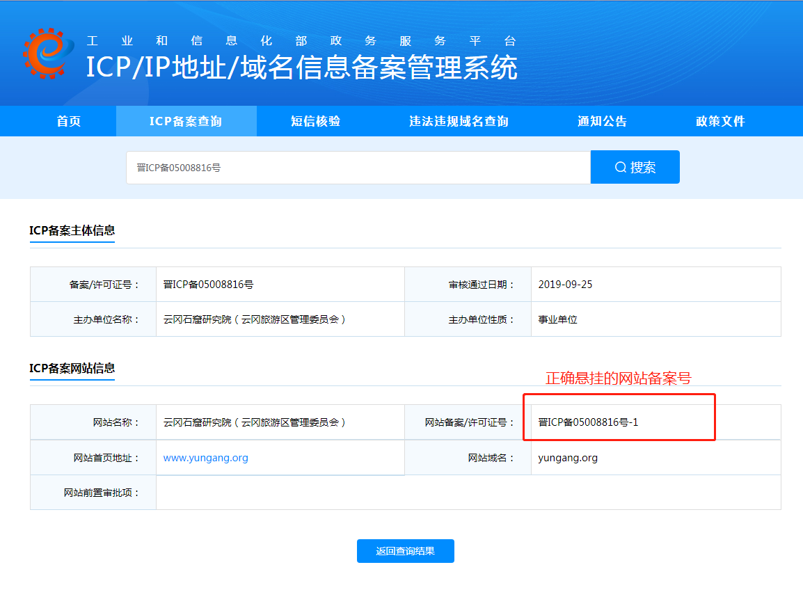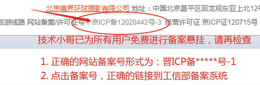 根據(jù)國家規(guī)定和管理要求,各網(wǎng)站主辦者在2021年1月20日(各接入商要求整改的時間不完全一致,大體在2021年1月下旬)前完成網(wǎng)站主頁底部網(wǎng)站備案號的懸掛和鏈接工作,特別提示:必須懸掛網(wǎng)站備案號,例如:晉ICP備****號-1;不可以懸掛主體備案號,例如:晉ICP備****號。鏈接須指向工信部備案管理系統(tǒng)網(wǎng)址(https://beian.miit.gov.cn)。若未及時整改,根據(jù)相關(guān)規(guī)定將面臨省通信管理局責(zé)令整改、并處五千元以上一萬元以下罰款的處罰,或應(yīng)相關(guān)監(jiān)管部門要求,網(wǎng)站有被關(guān)閉、備案被取消接入或網(wǎng)站備案被注銷的風(fēng)險。