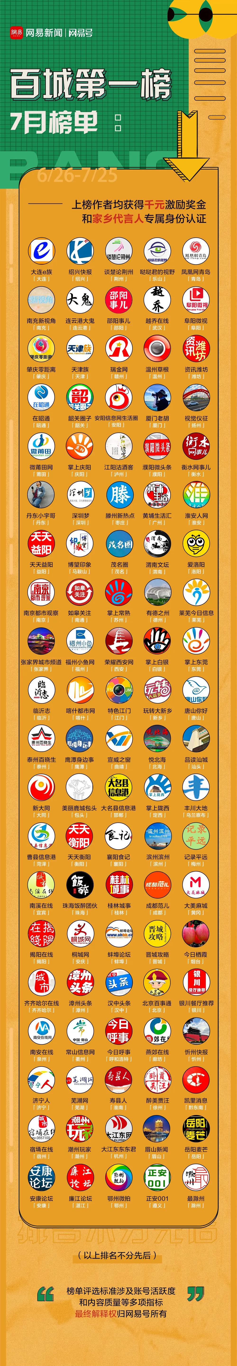 網(wǎng)易號(hào)“尋找家鄉(xiāng)代言人”系列扶持計(jì)劃之百城第一榜,旨在獎(jiǎng)勵(lì)為用戶提供多元化本地內(nèi)容的優(yōu)質(zhì)本地作者。升級(jí)版“百城第一榜”專注于扶持創(chuàng)作方向?yàn)楸镜爻院韧鏄?lè)、本地社會(huì)熱點(diǎn)、本地人文歷史的自媒體作者。榜單根據(jù)本地作者的發(fā)文數(shù)量、發(fā)文質(zhì)量、原創(chuàng)度、活躍度和互動(dòng)等多重?cái)?shù)據(jù)表現(xiàn)進(jìn)行評(píng)選。上榜賬號(hào)可獲得千元現(xiàn)金獎(jiǎng)勵(lì)、“家鄉(xiāng)代言人”專屬身份認(rèn)證和運(yùn)營(yíng)一對(duì)一發(fā)文指導(dǎo)等多項(xiàng)福利。