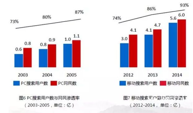 移動搜索的發(fā)展歷程與早期的PC很相似,不過移動搜索的發(fā)展更為快速。據(jù)百度2015年初發(fā)布的《移動互聯(lián)網發(fā)展趨勢報告》顯示,移動搜索已成為用戶規(guī)模僅次于社交通信的第二大應用垂類,且移動用戶的搜索需求(人均搜索次數(shù))呈現(xiàn)穩(wěn)步提升趨勢。此外,百度移動搜索流量也已超過了PC搜索。