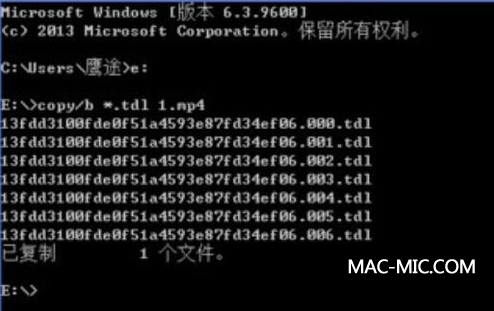 然后使用WIN圖標(biāo)鍵+R ,打開cmd ,輸入 e: 按下回車進(jìn)入e盤 ,然后輸入:copy/b *.tdl 1.mp4 對(duì)E盤下所有tdl格式的文件進(jìn)行合并。