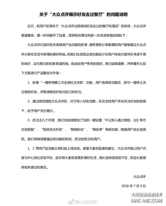 對此,大眾點評通過官方微博發(fā)布聲明,對因相關產(chǎn)品功能給用戶造成的困擾表示誠摯道歉,并提出了三條整改措施,包括新增“一鍵停用第三方全部社交關系”功能;通過微信登錄并導入好友關系,在支持用戶手動關注的情況下給予充分提示;增加包括一鍵設置“不讓別人通過微信、QQ等方式找到我”“取消關注好友”“移除粉絲”“黑名單”等新功能。