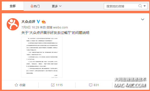 在7月9日的聲明中,大眾點評稱,大眾點評打造好友關系鏈類產(chǎn)品功能的初衷,是希望有分享意愿的用戶能夠通過大眾點評分享在生活中獲得的美好體驗,“但我們也發(fā)現(xiàn)這類功能設計在用戶體驗方面存在考慮不周的地方,這與我們的初衷背道而馳。”